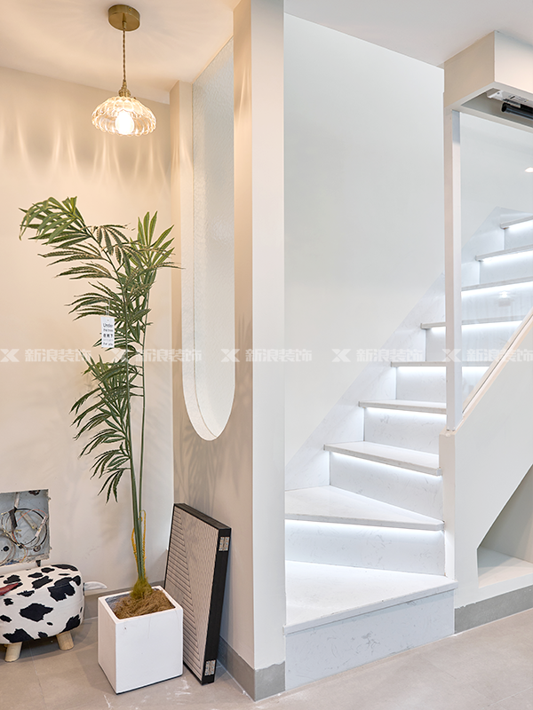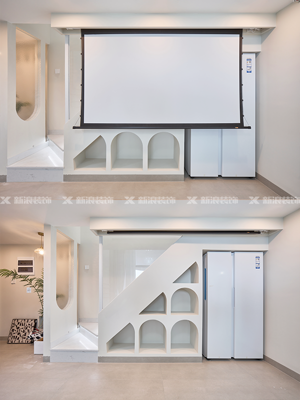 3.樓梯下方空間也不浪費!拱形展示格與室內整體的浪漫輕法式風(fēng)格融合。上方做升降投影幕布,在家觀(guān)影、看球超爽的!