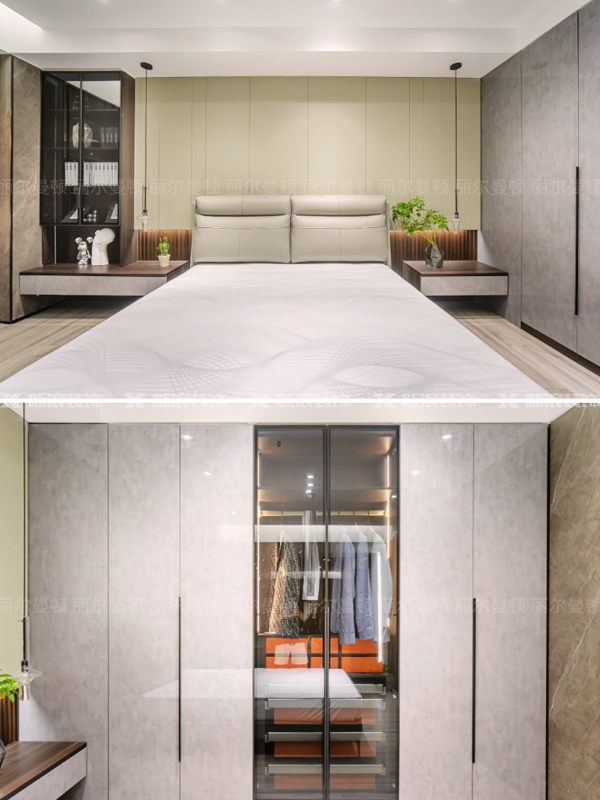 高端全屋定制:柜體板材為十環(huán)認證的萬(wàn)象天冠18mm厚杉木芯板、柜門(mén)是歐松板雙飾面門(mén)、奧地利進(jìn)口百隆五金。