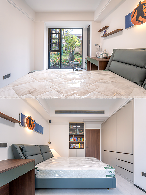 床尾做嵌入式衣柜,無(wú)拉手分節設計,簡(jiǎn)約又實(shí)用。