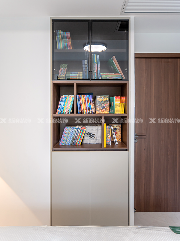 沿墻還做了兩組書(shū)柜,玻璃柜門(mén)搭配抽屜,收納充足不雜亂。