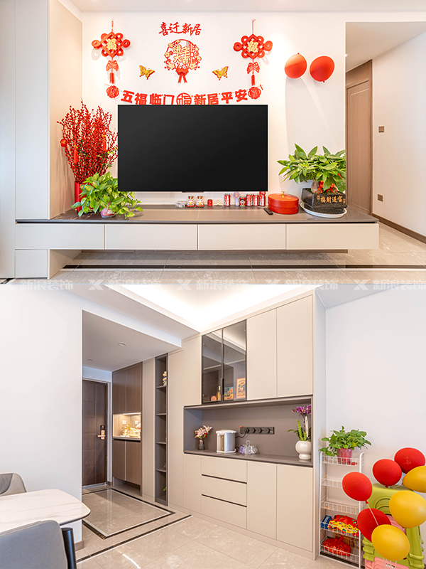 客廳利用穿插設計做了簡(jiǎn)單的電視背景柜。整個(gè)公共區域全部做了免拉手設計,利用免拉手的線(xiàn)條分割柜門(mén)。簡(jiǎn)單又不失細節,非常顯高級。