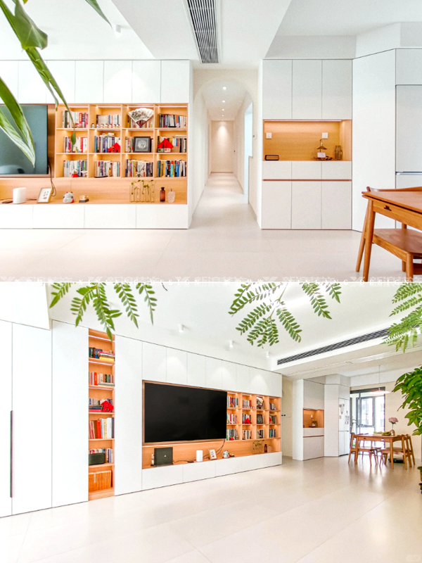 電視背景墻+書(shū)柜二合一,擺脫笨重茶幾,打造休閑開(kāi)闊的家居空間。