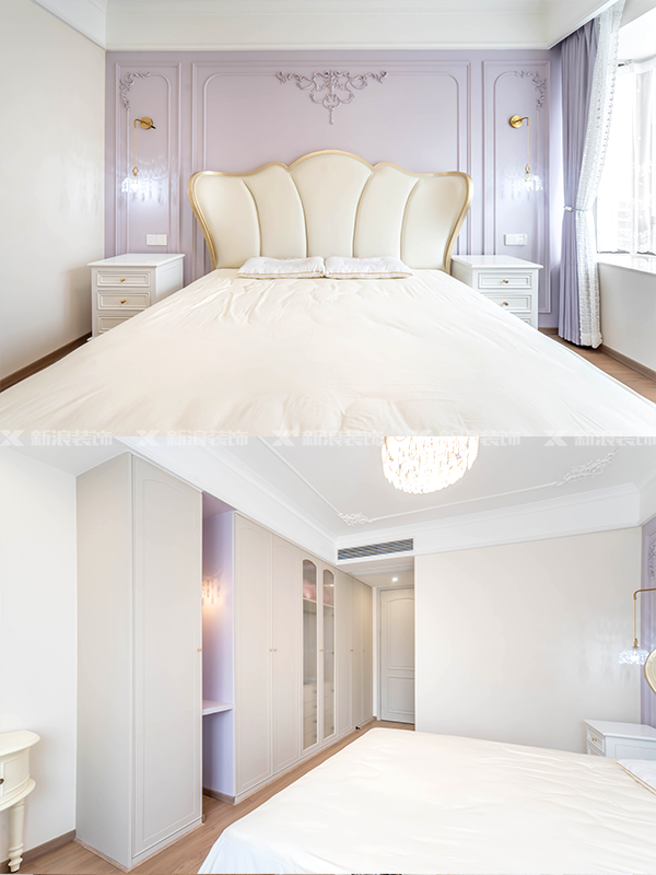 臥室用淺色系的背景墻做搭配,搭配造型柜,更顯優(yōu)雅