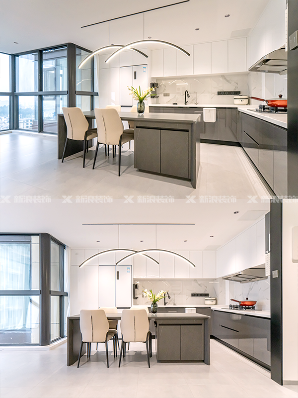 ?與定制柜同色的餐島臺和櫥柜,也是一大亮點(diǎn)。櫥柜采用符合人體工學(xué)的高低臺設計,洗切炒動(dòng)線(xiàn)合理,高光面板易清潔。