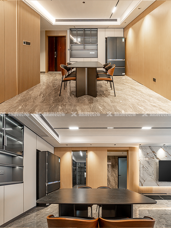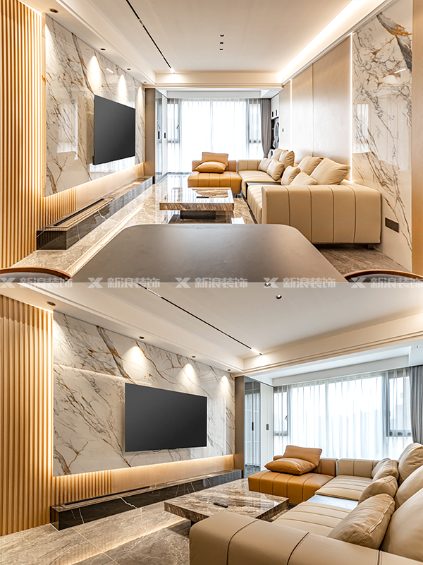 公共區域采用無(wú)主燈設計,用射燈、線(xiàn)形燈等氛圍燈光搭配巖板電視背景、沙發(fā)背景,