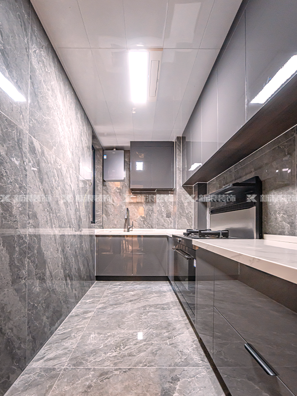 廚房做深灰高端實(shí)木定制櫥柜,亮面櫥柜門(mén)簡(jiǎn)約好打理衛生。