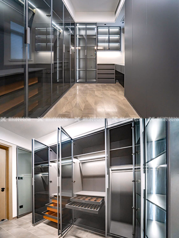 全屋定制柜用濟州灰+象牙灰膚感搭配,部分柜門(mén)做全鋁玻璃門(mén)