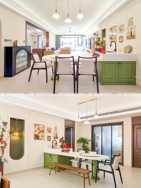 餐廳是白綠撞色的定制餐島臺,帶上下歲臺盆和移動(dòng)插座,實(shí)用美觀(guān)