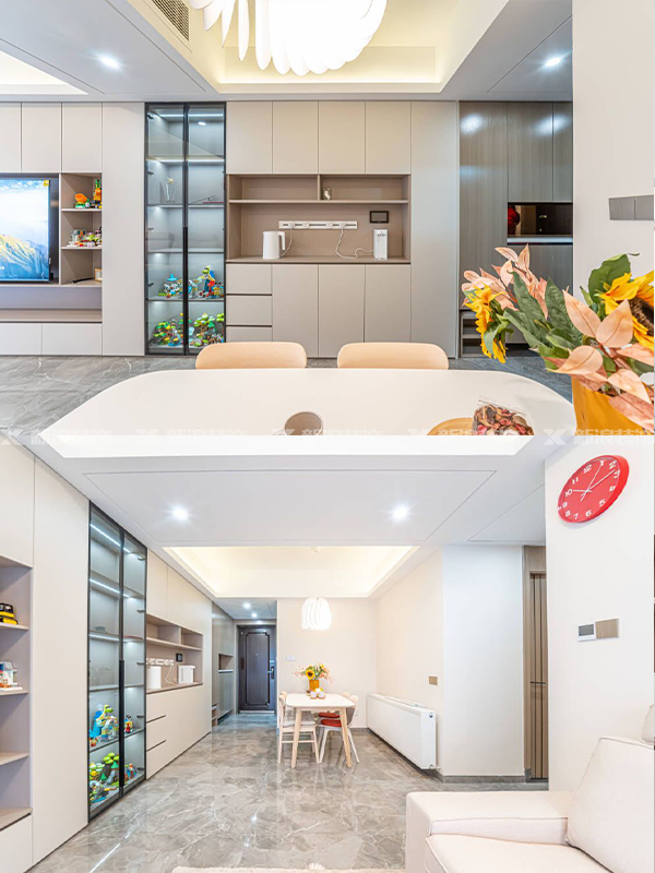 客餐廳和入戶(hù)空間直接結合戶(hù)型特點(diǎn)做滿(mǎn)墻的定制收納,鞋柜、餐邊柜、電視柜都在一個(gè)平面,簡(jiǎn)潔利落,且讓空間得到最大化利用。