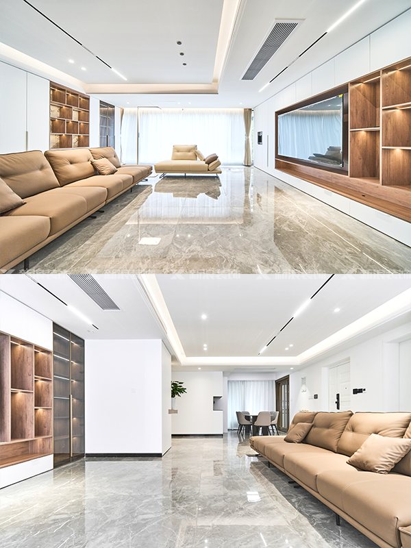 沙發(fā)背景和電視背景互相呼應,做同色設計,格柵+巖板進(jìn)行局部點(diǎn)綴,增添亮點(diǎn)